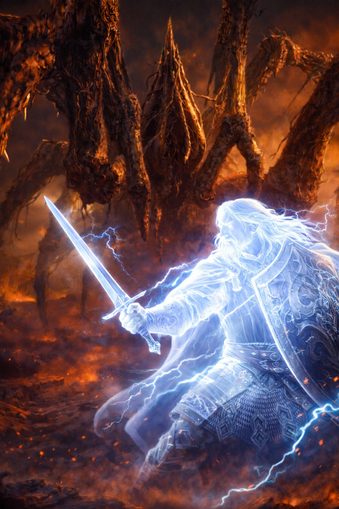 The light grows larger and larger and out of it emerges a psychic manifestation of Kas from Dungeons and Dragons. Will controls its body, El controls its sword, and Kali controls its shield.