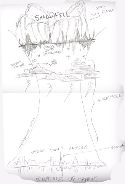 (The inspiration for this scene comes from a sketch that the Duffer Brothers did of the Abyss (Shadow-Fell) and its connection to the Upside-Down and Right-Side-Up. You can see that they show “Hopper’s Chopper” in the picture).